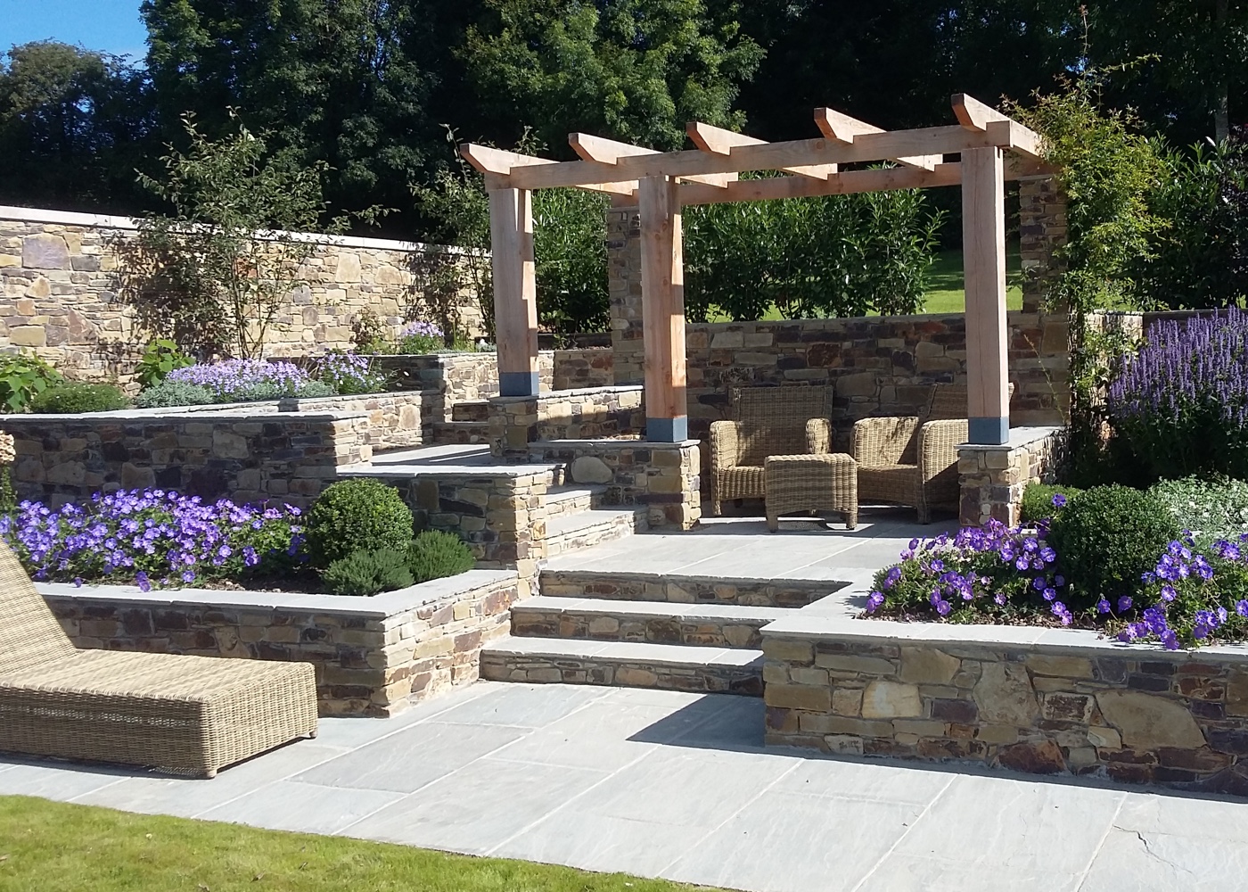 This paving and patio project was designed to create a structured, multi-level outdoor living space that blends functionality with strong visual impact. Castle Masons transformed the garden into a series of usable zones featuring natural stone paving, raised beds, integrated seating areas, and a central pergola feature.